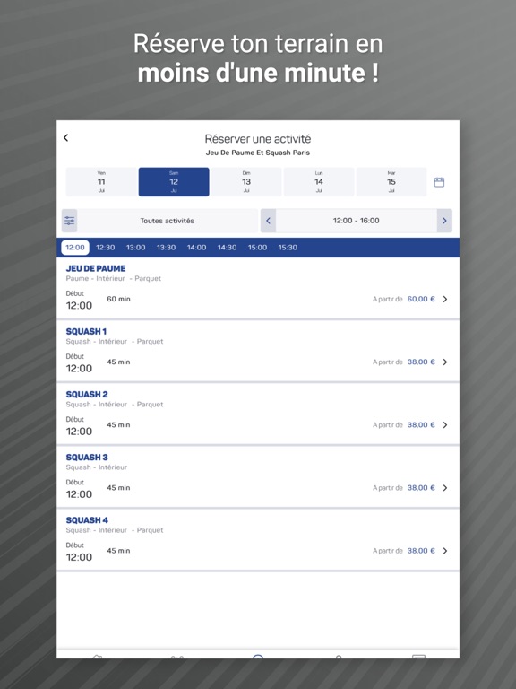 Fini la corvée de téléphone ! Avec l'application tu n'as plus qu'à accéder aux créneaux disponibles et à en choisir un. Le club recevra alors automatiquement ta réservation.