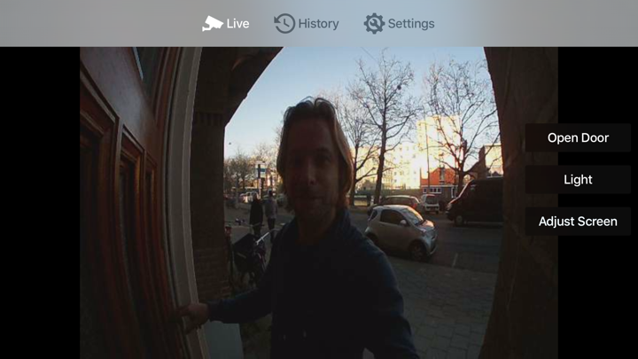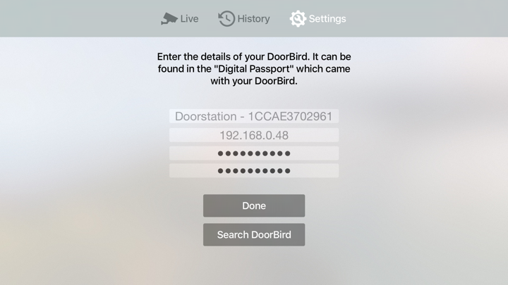 BirdTV supports streaming of the video, opening the door (if connected), switching on the IR light and browsing History images. Talking to the person at the door or hearing them is not supported yet as doorbird did not release this possibility yet. On top of that the AppleTV microphone on the remote is not yet available to developers.