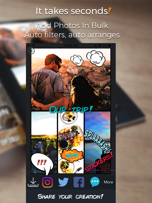 Comic Strip allows you to bulk select images and it then auto filters, auto arranges for speedy results, after that you get to do the fun part, add filters, stickers, text bubbles, titles, play with fonts and colors and share it with people close to you.