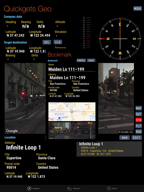 With Quickgets Geo you can quickly get the course in which you are, current speed, altitude, geographical coordinates, orientation and weather indicators by using the internal compass and GPS. As a new feature, now Quickgets Geo supports advanced bookmarking, Street View and Flyover live mapping of current position, multiple units, distance, bearing, deviation, 5 day weather forecast, and current radar images.