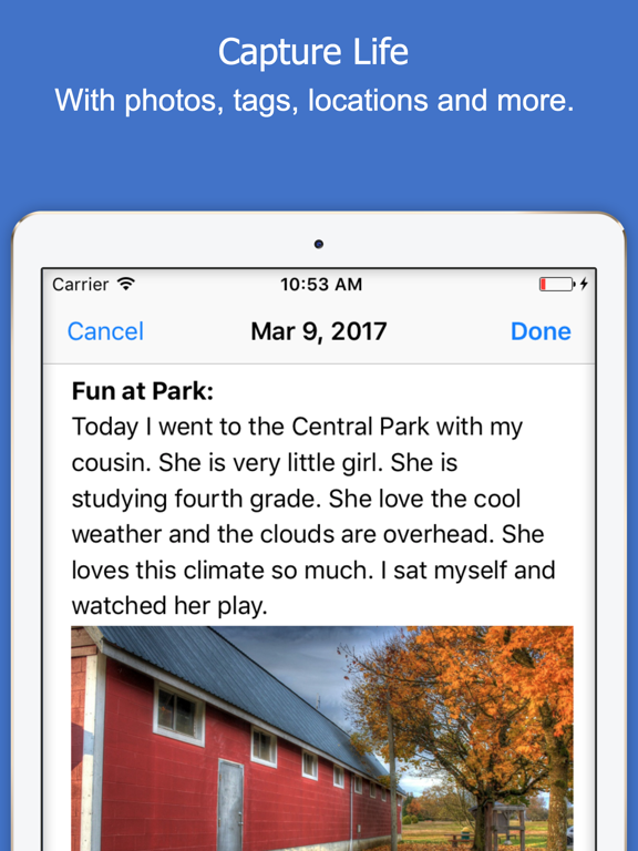 Reminisce Journal helps you to capture life moments, daily activities, thoughts, ideas and travel logs.