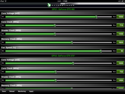 This iOS overclocking utility “Afterburner APP” was co-developed by MSI and well-known software programmer Nick Connors. This new Afterburner utility allows the iPhone, iPod Touch and iPad devices to adjust or monitor MSI Afterburner settings on PC over a Wi-Fi connection. In addition to monitoring the temperature, voltage and fan speed, the utility can also be used for overclocking and overvoltaging!