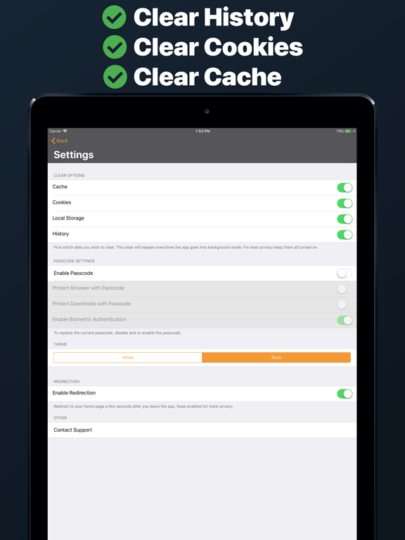 Toutes ces caractéristiques font de Navigateur Privé Web Incognito un excellent navigateur qui vous garde en sécurité et s'efface derrière vous. Vous n'avez rien à faire, vous n'avez qu'à activer le commutateur d'effacement souhaité et à le laisser faire le reste !