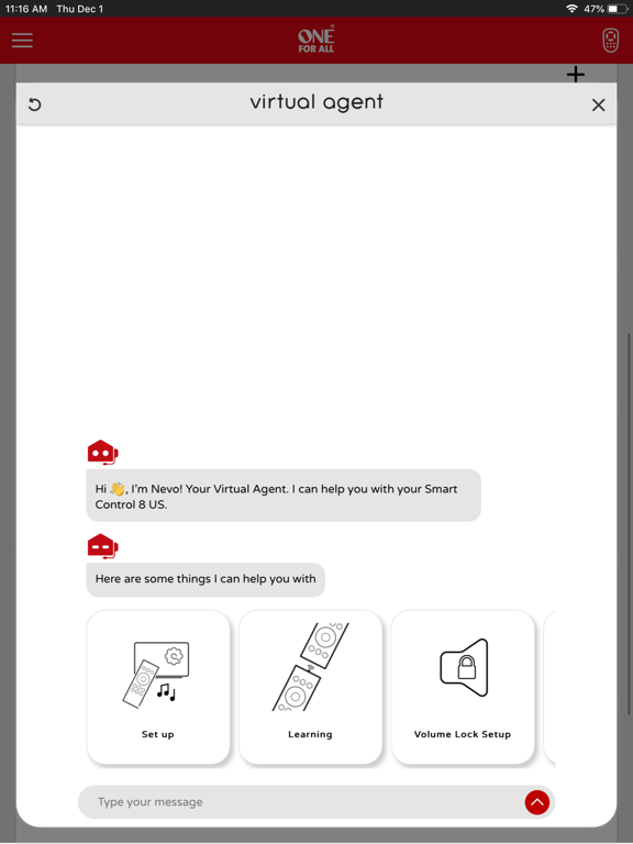 The One For All Setup app is used to set up devices on the One For All Smart Control (URC 7980). The app uses Bluetooth Low Energy (also known as Bluetooth Smart) to communicate with the remote control, giving access to the full online database of over 7,000 brands and 335,000 individual models of Audio/Video devices. Devices can be set up by model search, function search or directly selecting the code. The app also gives you access to the Remote Finder functionality, allowing you to locate your remote by simply pressing a button and listening for the beep.