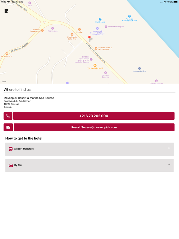 Situé sur le front de mer du quartier de la corniche de Sousse, le Mövenpick Resort & Marine Spa Sousse n’est qu’à 5 minutes en voiture du centre-ville. Les transferts de/vers l'aéroport sont disponibles sur demande 24/24. Ils peuvent être organisés à partir des aéroports inernationaux de Monastir, Enfidha ou Tunis-Carhage. Heure d'arrivée: 15 h Heure de départ : 12.00 heures