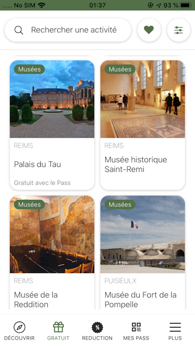 L’application Reims City Pass permet à son utilisateur de consulter la liste des sites partenaires du Reims City Pass même sans connexion internet, et pour chacun d’eux d’obtenir des informations détaillées : Nom, Photo(s), description, adresse postale, localisation sur la carte google Maps, horaires, lien site internet, téléphone, contact, événements liés, prestataires aux alentours. Ainsi il dispose d’un guide touristique numérique interactif pour l’accompagner pendant son séjour dans la région de Reims.